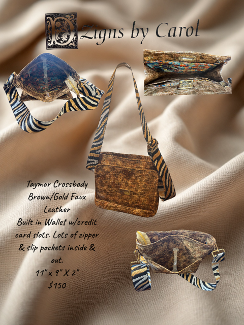 Taymor Crossbody Brown/Gold Faux Leather Built in Wallet w/credit card slots. Lots of zipper & slip pockets inside & out. 11″ x 9″ x 2″